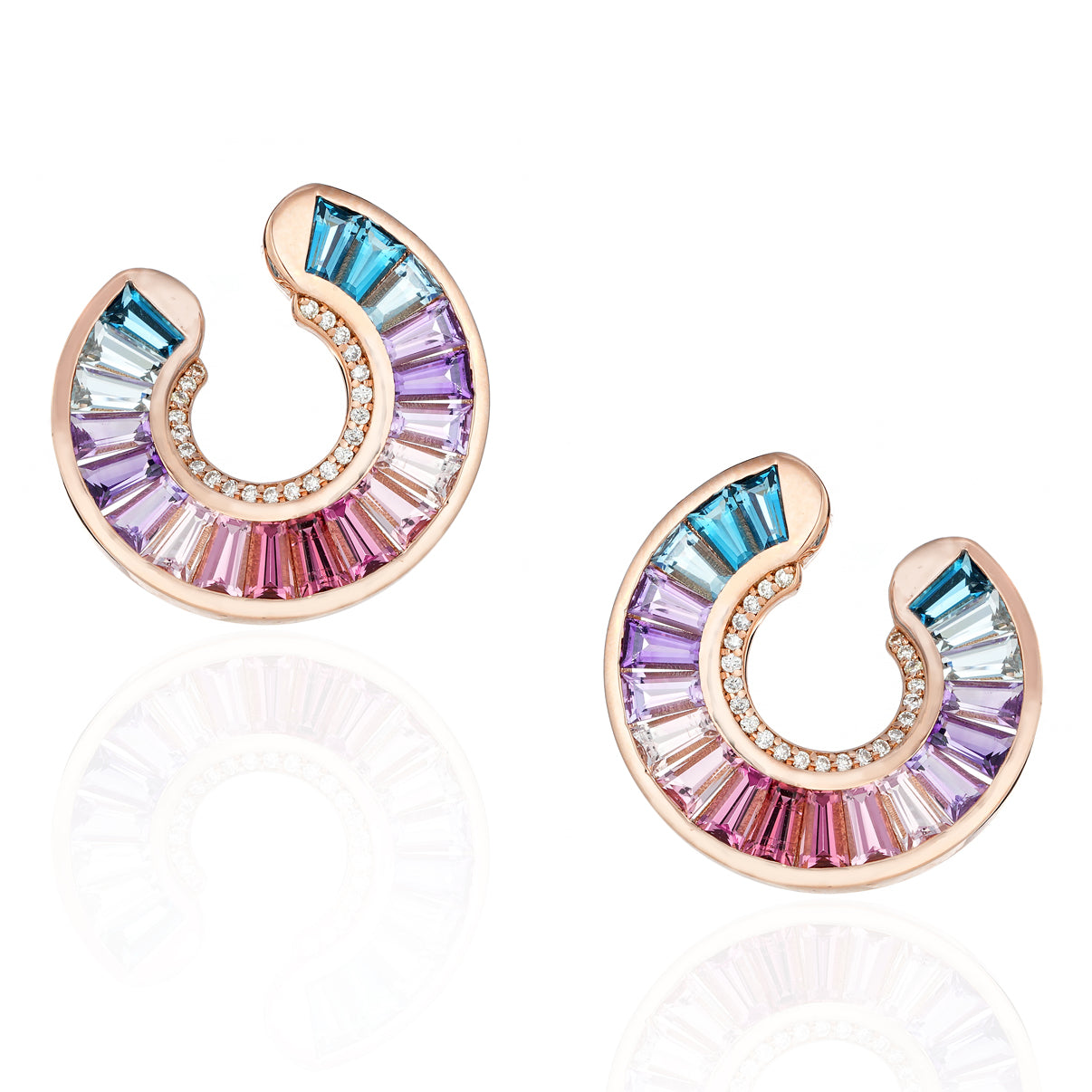 تتميز هذه الأقراط على شكل حرف C المصنوعة ببراعة من الذهب الوردي عيار 18 قيراطًا بتدرج غني من الأحجار الكريمة - من الأكوامارين والتوباز الأزرق اللندني إلى الجمشت والتورمالين - بإجمالي 4.15 قيراط في طيف جريء من اللون الأرجواني إلى الأزرق.