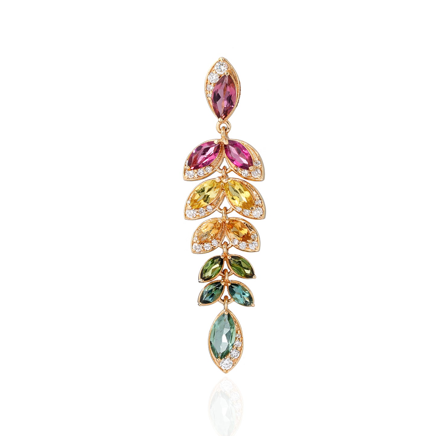 تتميز هذه القلادة على شكل بتلة وتألق كامل، وتزهر بـ 1.40 قيراط من التورمالين بألوان قوس قزح و0.19 قيراط من الماس في ذهب أصفر عيار 18 قيراطًا.
