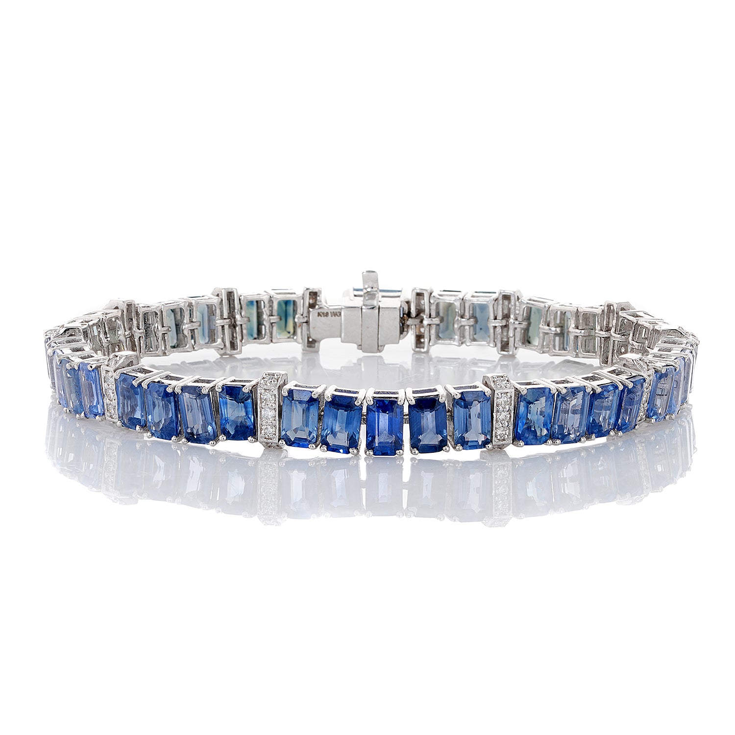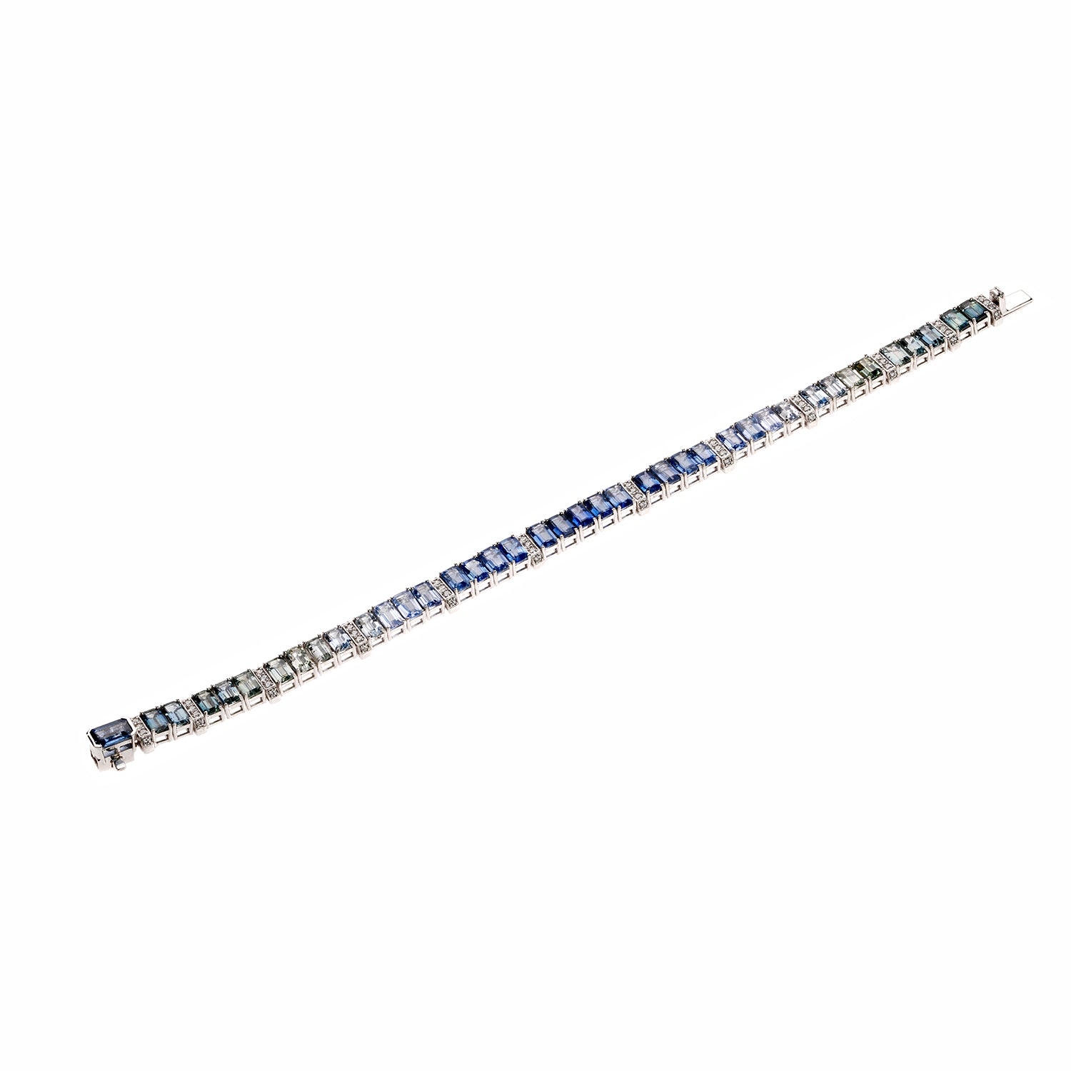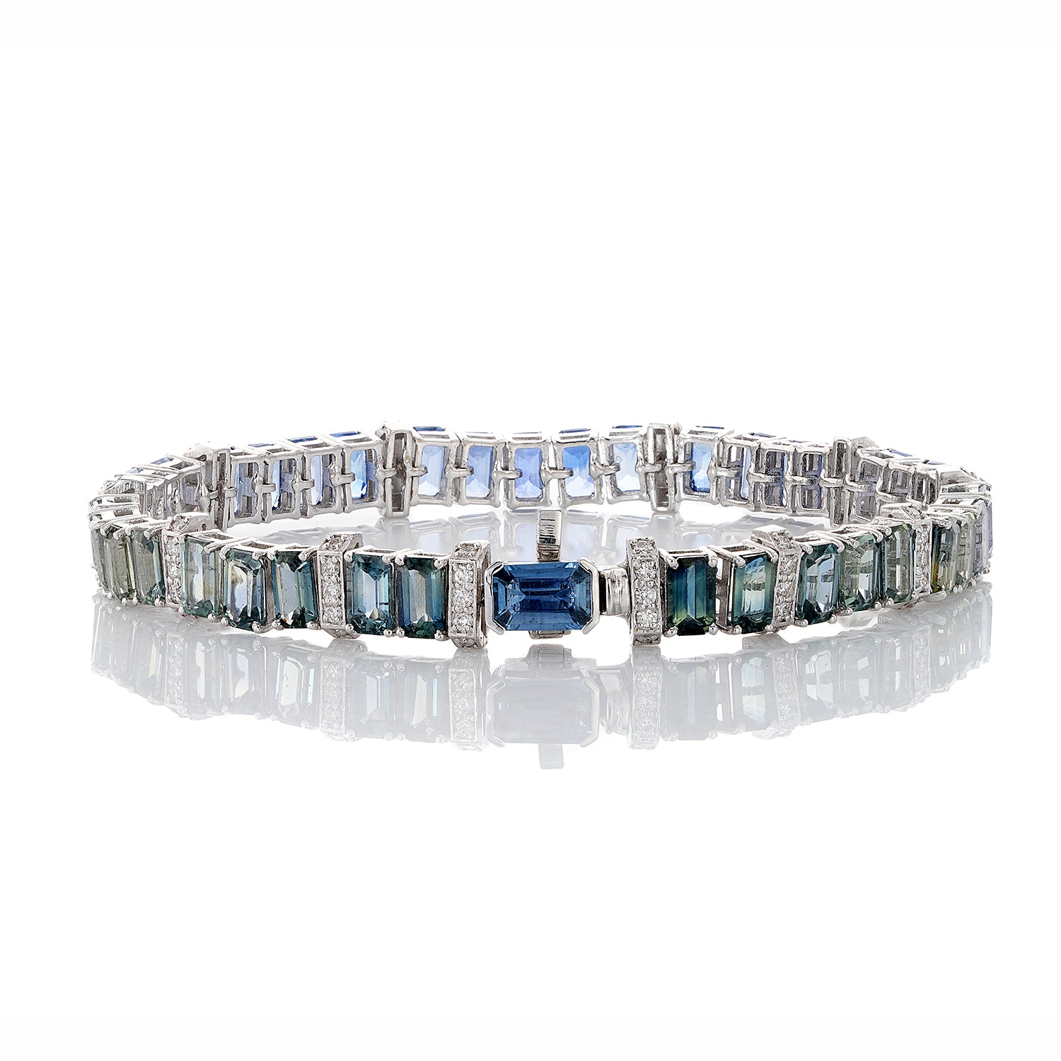 Crafted in 18K white gold, this tennis bracelet captures a serene ombré blend of cool blue and refreshing green sapphires totaling 14.90 carats. A single blue sapphire anchors the gradient, while 0.46 carats of diamonds lend a luxe finishing touch.