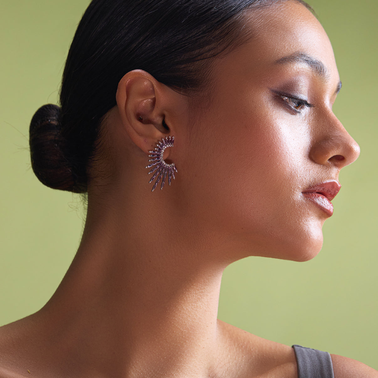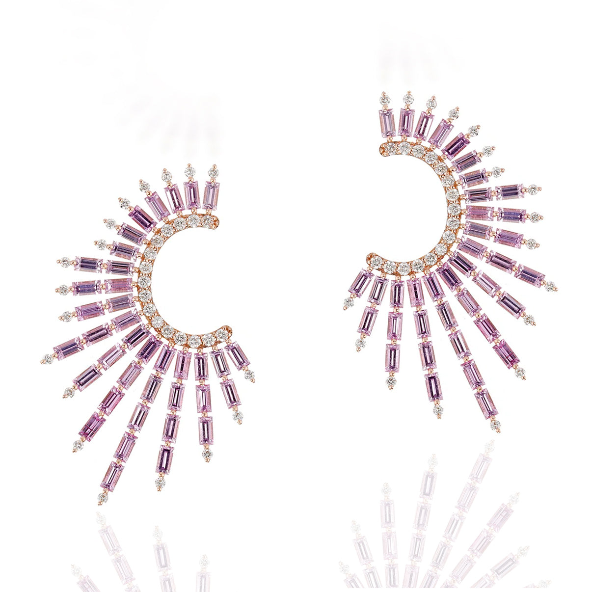 These vibrant stud earrings are designed in 18K yellow gold and radiate with 5.10 carats of baguette-cut pink sapphires, encircled by 0.63 carats of sparkling diamonds in a modern sunray silhouette.