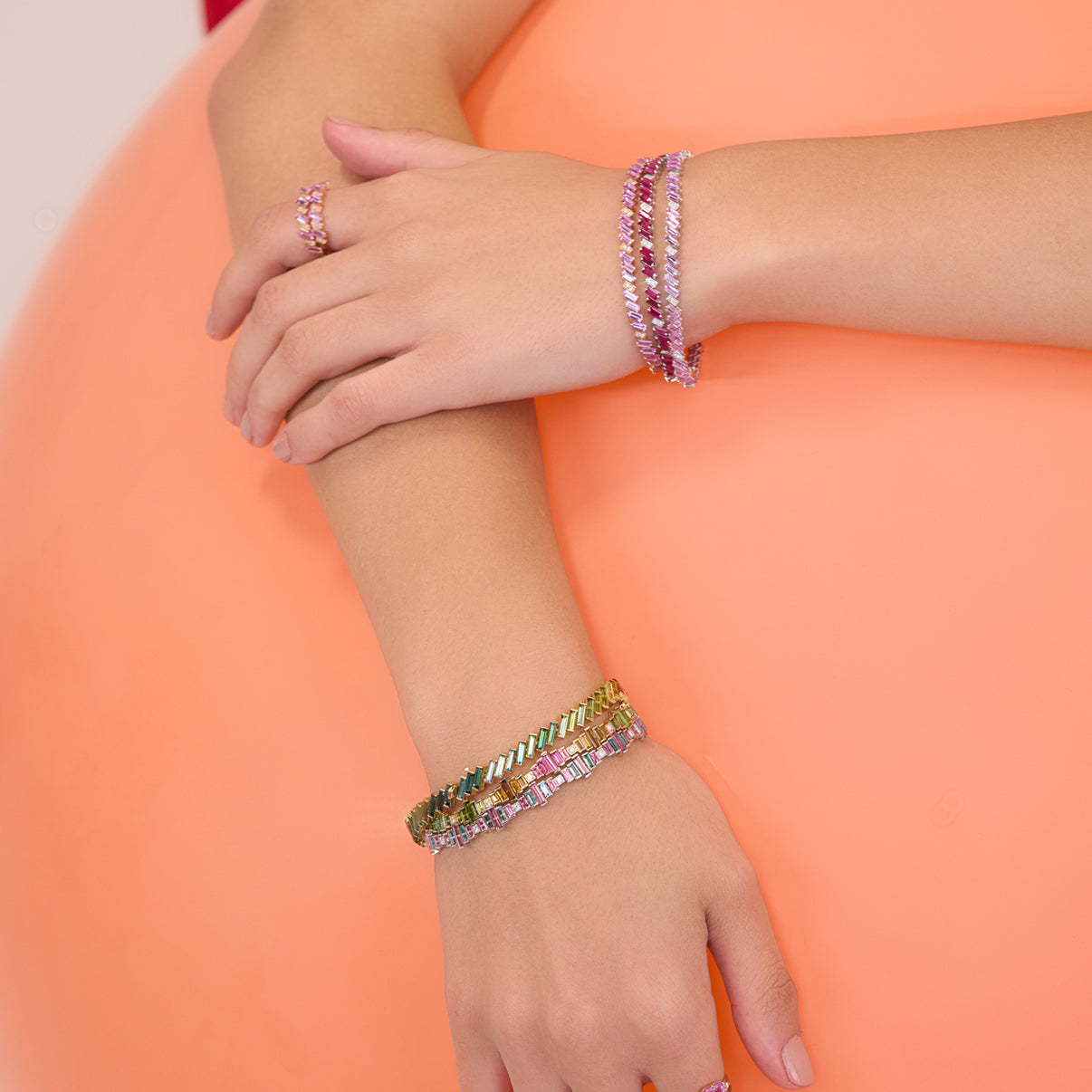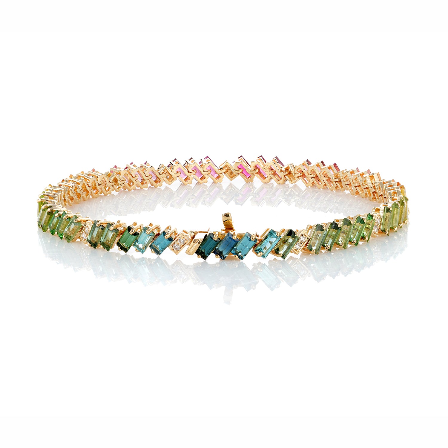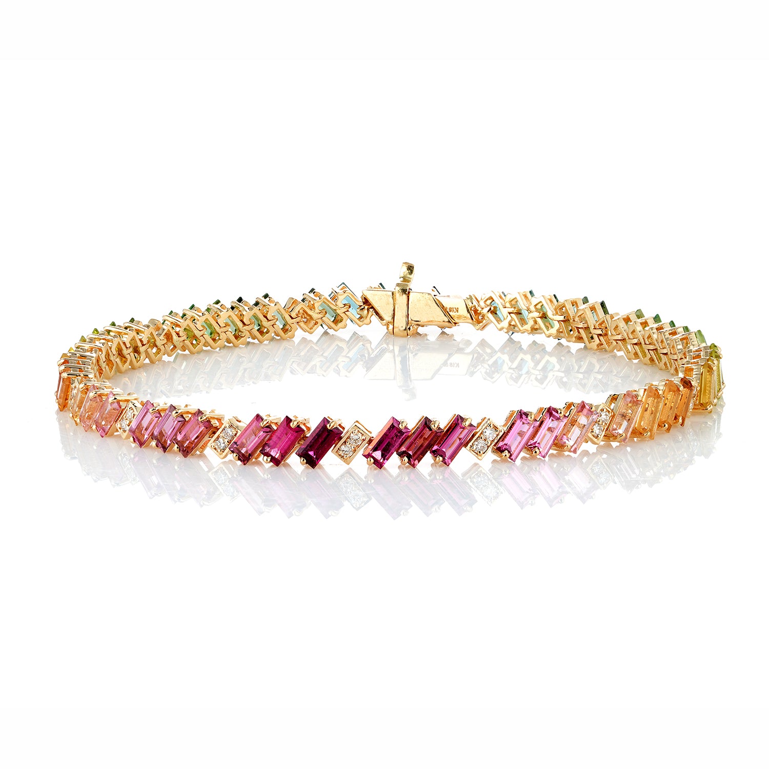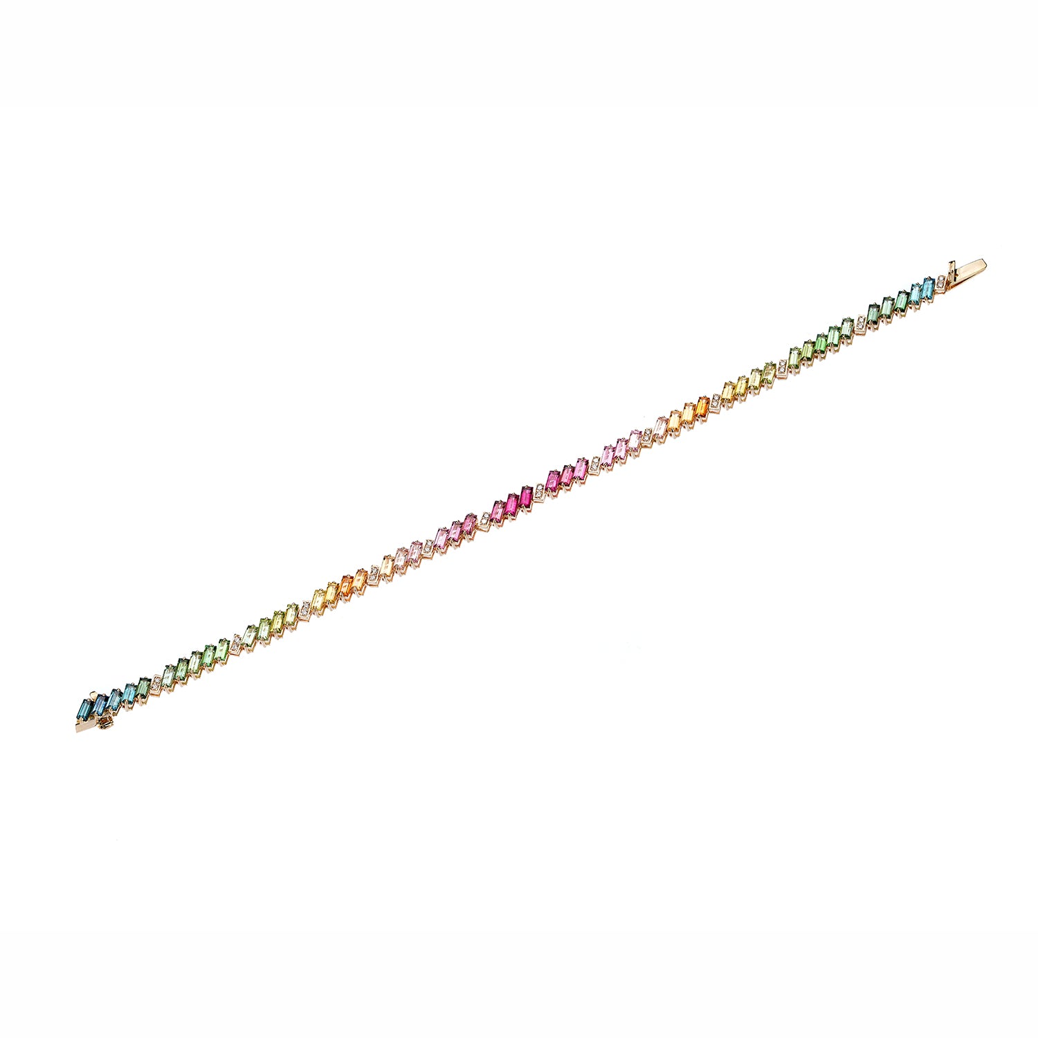 This 18K yellow gold tennis bracelet features 5.90 carats of multicolor tourmaline baguettes interspersed with 0.16 carats of diamonds, creating a dynamic yet elegant spectrum of light.