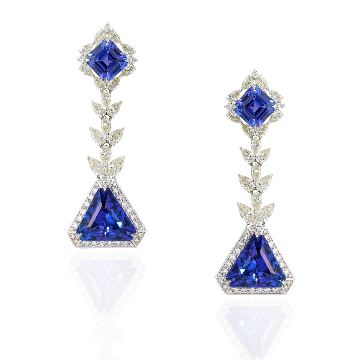 A dramatic play of geometry and grandeur, these 18K white gold danglers spotlight 22 carats of vivid tanzanite in both triangle and octagon cuts delivering depth and movement in every angle. A cascade of pear and round diamonds totaling 4.90 carats enhances the regal silhouette with exceptional brilliance.